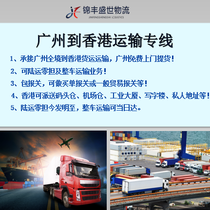深圳市錦豐盛世物流有限公司致力于打造國(guó)內(nèi)高效、快捷、安全的香港物流服務(wù)專線。主打廣州到香港物流專線,廣州到香港整車及零擔(dān)運(yùn)輸,廣州到香港快件運(yùn)輸,廣州到香港一般貿(mào)易出口運(yùn)輸,代理報(bào)關(guān),商檢,清關(guān)及香港全境派送服務(wù)。